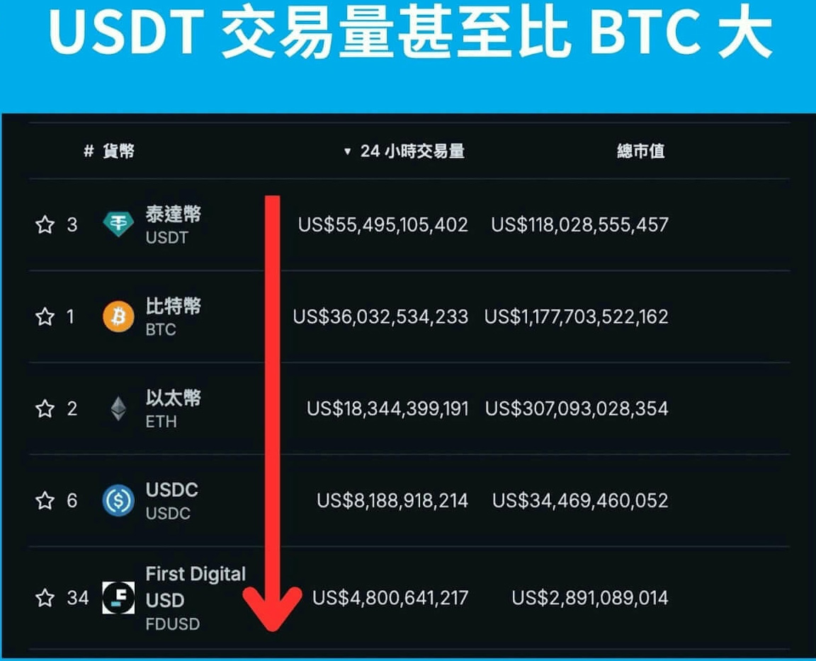 如果用交易量做个对比,「泰达币」的交易量甚至比「比特币」还大,显现其应用之广泛。