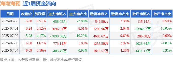 资金流向数据方面,本周海南海药主力资金合计净流出84.69万元,游资资金合计净流入9517.6万元,散户资金合计净流出9432.91万元。本周资金流向一览见下表: