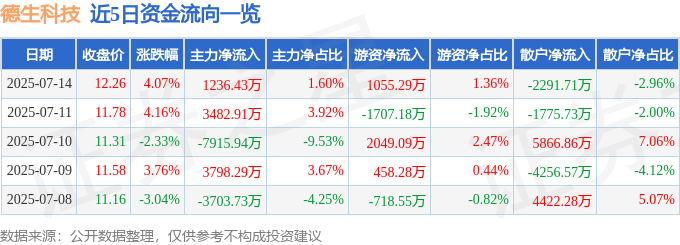 7月14日的资金流向数据方面,主力资金净流入1236.43万元,占总成交额1.6%,游资资金净流入1055.29万元,占总成交额1.36%,散户资金净流出2291.71万元,占总成交额2.96%。