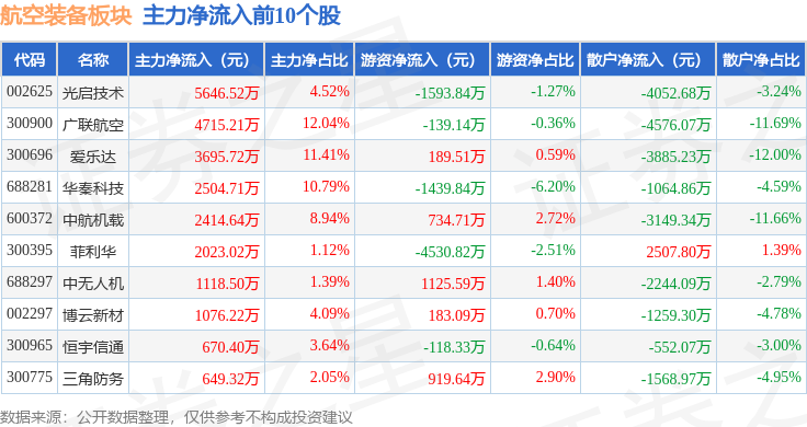 从资金流向上来看,当日航空装备板块主力资金净流出2.57亿元,游资资金净流入2.22亿元,散户资金净流入3511.27万元。航空装备板块个股资金流向见下表: