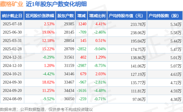 证券之星消息,近日藏格矿业披露,截至2025年7月18日公司股东户数为2.94万户,较6月30日增加1240.0户,增幅为4.41%。户均持股数量由上期的5.58万股减少至5.34万股,户均持股市值为233.78万元。