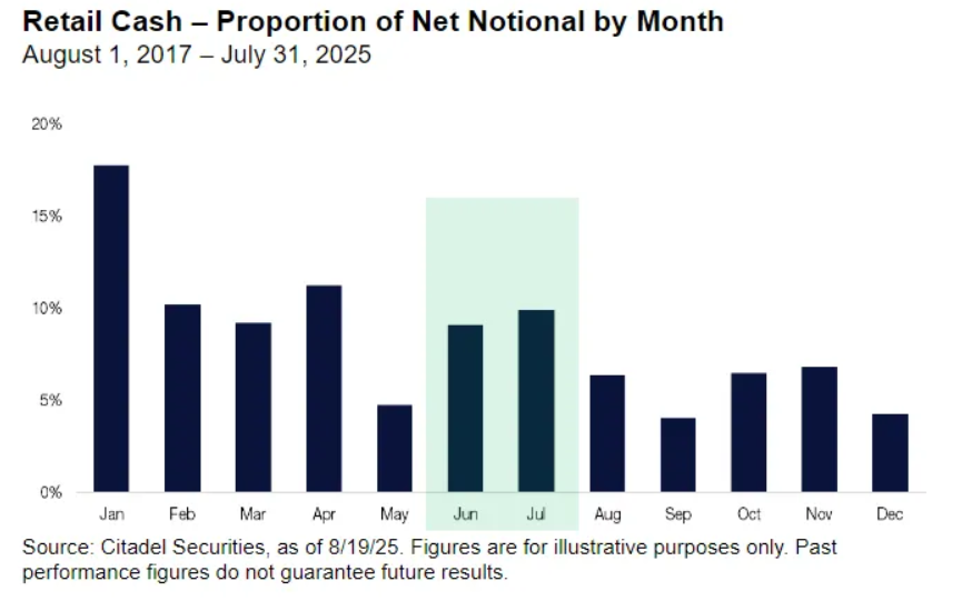 如果历史数据可资借鉴,这股猛烈的散户买盘势力在短期内可能会大幅减弱。Citadel Securities追溯至2017年以来的数据表明,在无比强劲的 6月和7月之后,散户们整体买入活动通常在8月开始显著放缓,而9月往往标志着全年散户参与度的相对低点。历史数据显示,这股买入力度往往会在第四季度再次回升。