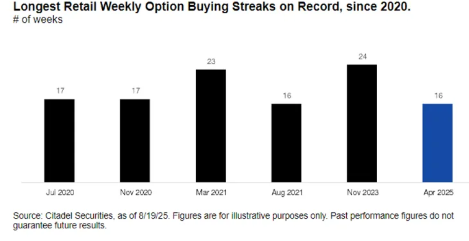 Citadel Securities汇编的统计数据显示,散户投资者们在过去18周中有16周是美国股票市场的净买家,并且已连续16周成为股票期权的净买家,这是自2020年以来持续时间第六长的看涨连胜。