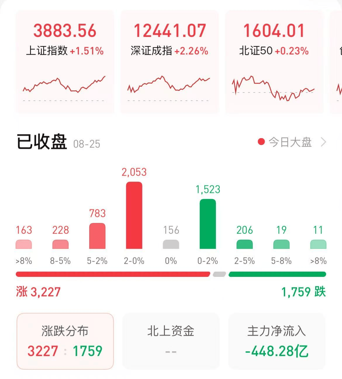 今天(8月25日),A股全天震荡走高,沪指逼近3900点,创业板指领涨。截至收盘,上证指数涨1.51%,深证成指涨2.26%,创业板指涨3%;北证50涨0.23%。全市场3227只股票上涨、1759只股票下跌,其中92只涨停、8只跌停。