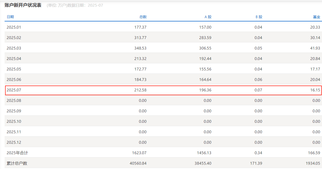 截至7月31日,今年以来A股合计新开户数量为1456.13万户,与2024年前7月1063.79万开户数量相比,同比增长36.88%。