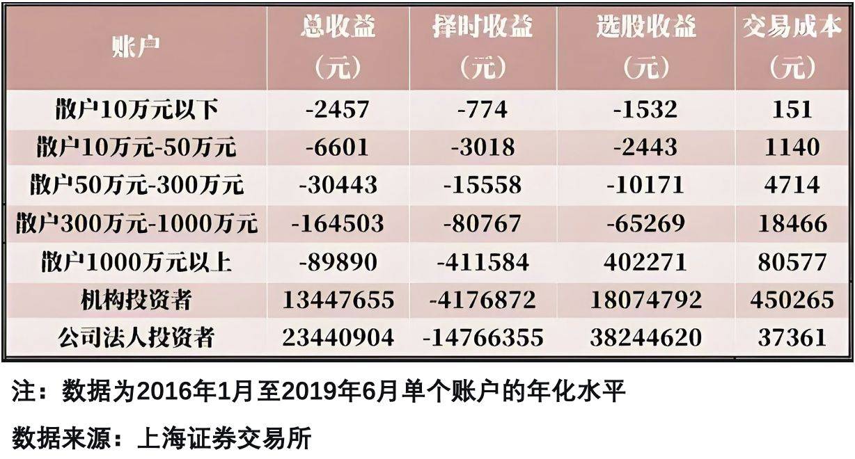 说出来可能伤自尊,但数据不会说谎。上交所2016-2019年的统计显示:所有资金规模的个人投资者平均收益都是负数。相比之下,机构投资者平均赚了1344万。更讽刺的是,2015年大牛市里散户亏得更多!