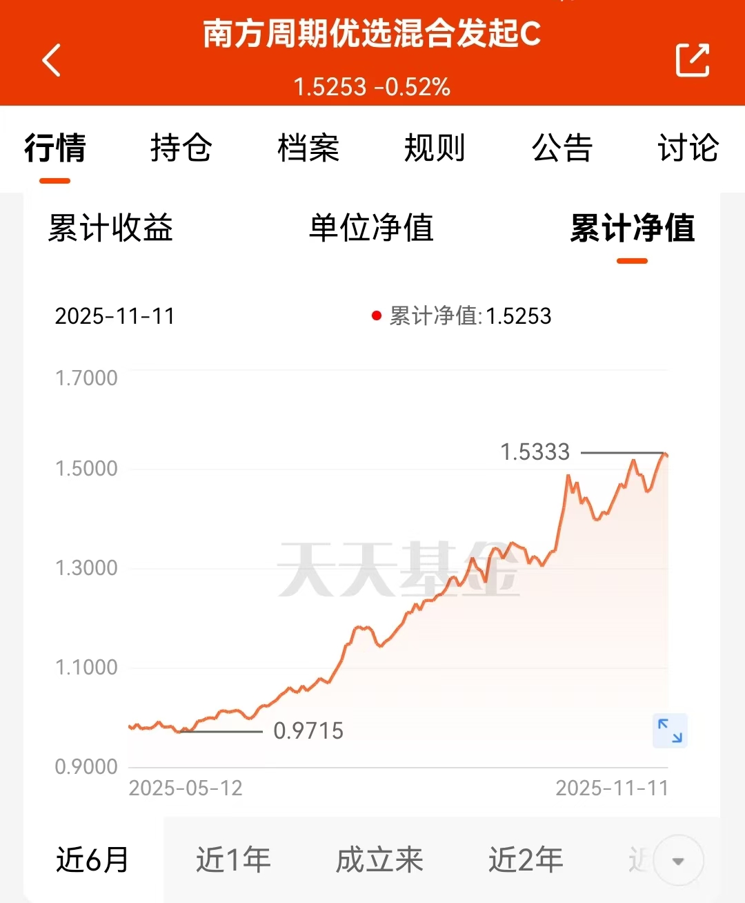 散户最怕啥?一买就套,一卖就飞!但$南方周期优选混合发起C$(021712)最近三个月涨了25%+,说明经理对节奏拿捏得挺准。我研究过他的操作,二季度市场挖坑的时候,他反而把股票仓位一口气提了18个百分点,明显是敢在低点动手。周期型基金就这么个好处:经济数据好转时,像化工、机械这些板块弹性大,一旦启动,净值反弹也猛。另外,这基金夏普比率0.0394,意味着每承担一单位风险,赚到的收益还不错的。对于咱们小资金来说,这种既控回撤又抓机会的品种,比瞎折腾强多了!