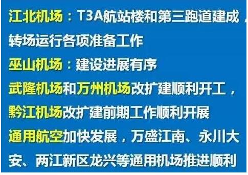 ,我市将投用江北机场T3A航站楼和第三跑道。开工黔江机场改扩建项目,目前,黔江机场