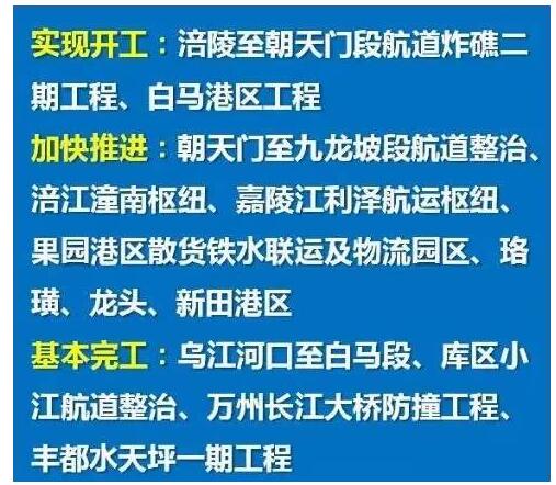 :力争开工新生、渭沱、朱沱港区,乌江白马至彭水枢纽航道支持保障系统,以及开工汤溪河等三峡库区重要支流航道整治项目。同时,我市将完成利泽航运枢纽前期工作,力争今年开工。同时,我市还将加快推进嘉陵江草街库尾航道整治、涪江潼南航电枢纽等重点项目建设。