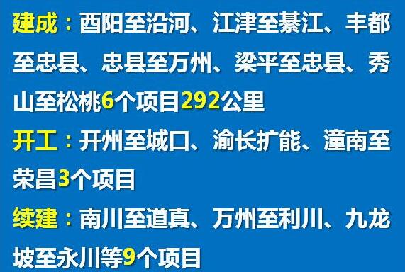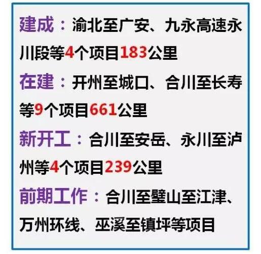 ,高速公路建设强势推进。通车总里程达到2818公里,省际出口通道达到16个,路网密度3.42公里/百平方公里。同时开州至城口、渝长扩能、潼南至荣昌3个项目、320公里如期动工。2017年计划