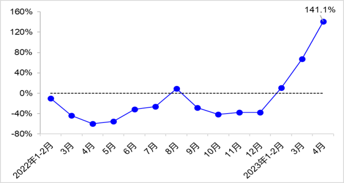 营业性客运量方面,4月完成营业性客运量7.8亿人,同比增长141.1%。其中,完成公路客运量3.8亿人,同比增长49.7%;完成水路客运量2176万人,同比增长403.7%。14月,完成营业性客运量27.3亿人,同比增长46.3%。其中,完成公路客运量13.6亿人,同比增长11.2%;完成水路客运量7294万人,同比增长136.9%。