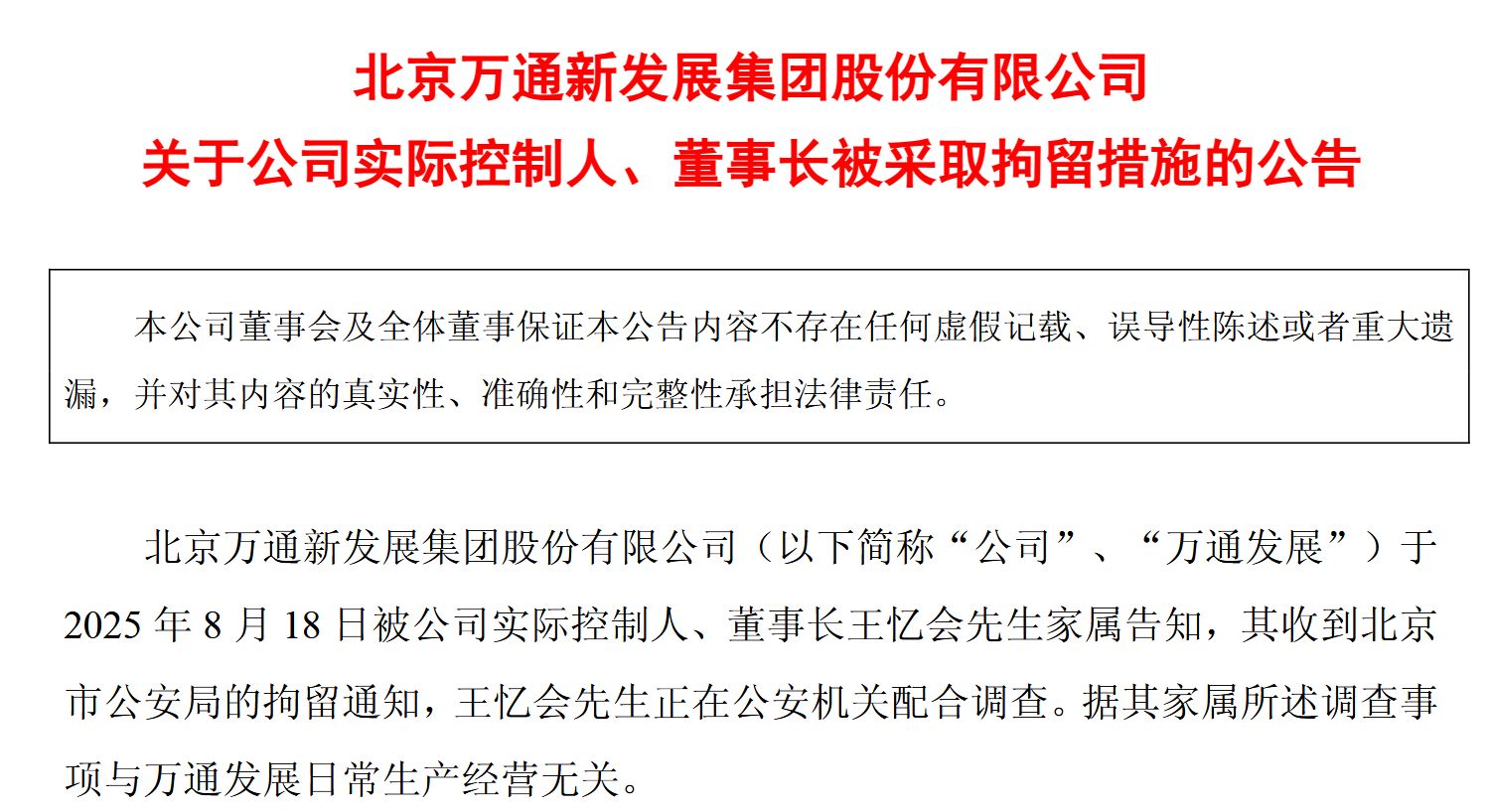 此前的8月18日晚,万通发展公告称,公司实际控制人、董事长王忆会的家属收到北京市公安局的拘留通知,王忆会正在公安机关配合调查,由钱劲舟代为履行公司董事长、法定代表人职责及董事会战略委员会主任委员、提名委员会委员职责。