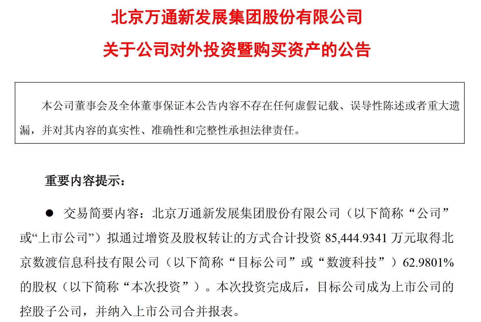 根据万通发展8月10日公告,其将通过增资及股权转让方式,合计投资8.54亿元取得数渡科技62.9801%股权。交易完成后,数渡科技将成为万通发展控股子公司,并纳入合并报表。