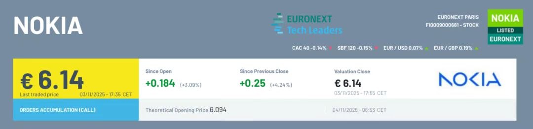 诺基亚股票于2015年11月在巴黎泛欧证券交易所挂牌上市。截至11月3日收盘,诺基亚每股报6.14欧元,较上一日收盘价上涨4.24%;公司最新市值为342.36亿欧元,折合人民币约2670亿元。