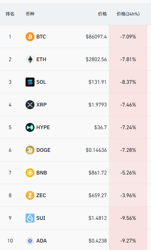 11月21日,加密货币市场集体大跌,截至13:52,比特币跌逾7%,自4月以来首次跌破87000美元,报86097.4美元。其他知名加密货币同步下跌,以太币跌近8%,索尔币跌8.37%,狗狗币跌7.28%。