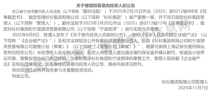 据悉,杉杉集团及宁波朋泽新一轮重组计划于11月7日首次披露于全国企业破产重整案件信息网和上交所。